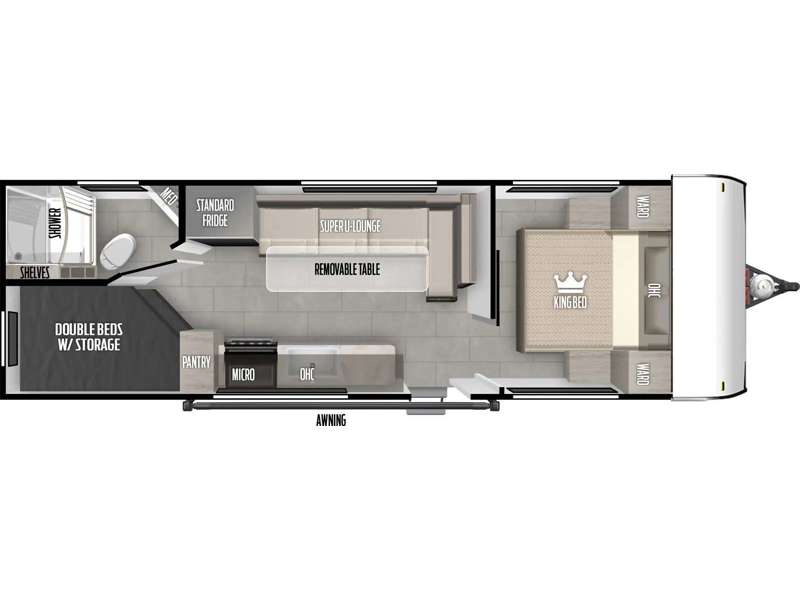 Camping is made easy in this travel trailer with more sleeping space and lots of comforts! The kids or your guests will enjoy the double-size bunks in the back, along with the full bath close by for easy nighttime use. You'll have the front private bedroom with a king bed all to yourselves, and there are dual bedroom wardrobes to keep your space neat and clean. Everyone can meet in the combined kitchen and living room to relax on the super U-lounge with a removable table while the chef of your group makes breakfast on the two-burner cooktop. There is also a microwave oven for quick meals, plus a pantry and 4.5 cu. ft. refrigerator for food storage!